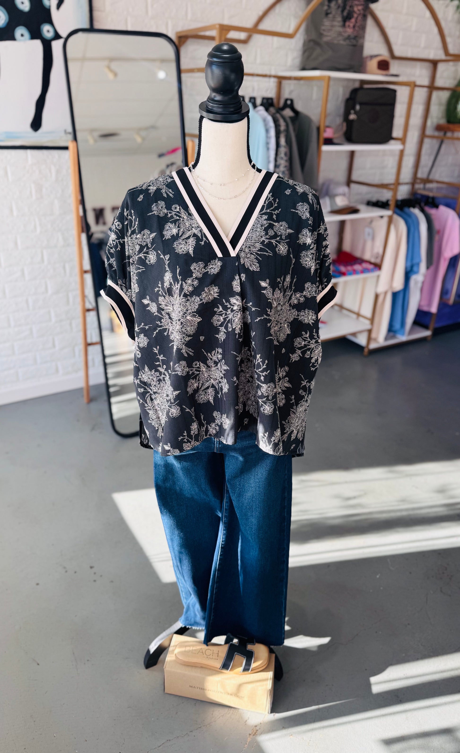 "The Black Floral Blouse is a fashionable and versatile addition to any wardrobe. With its floral print design, slightly oversized fit, and short dolman sleeves, this top is both trendy and comfortable. The multicolor band adds a pop of color and adds an eye-catching detail. Perfect for any occasion, this top is a must-have for any fashion-forward individual."