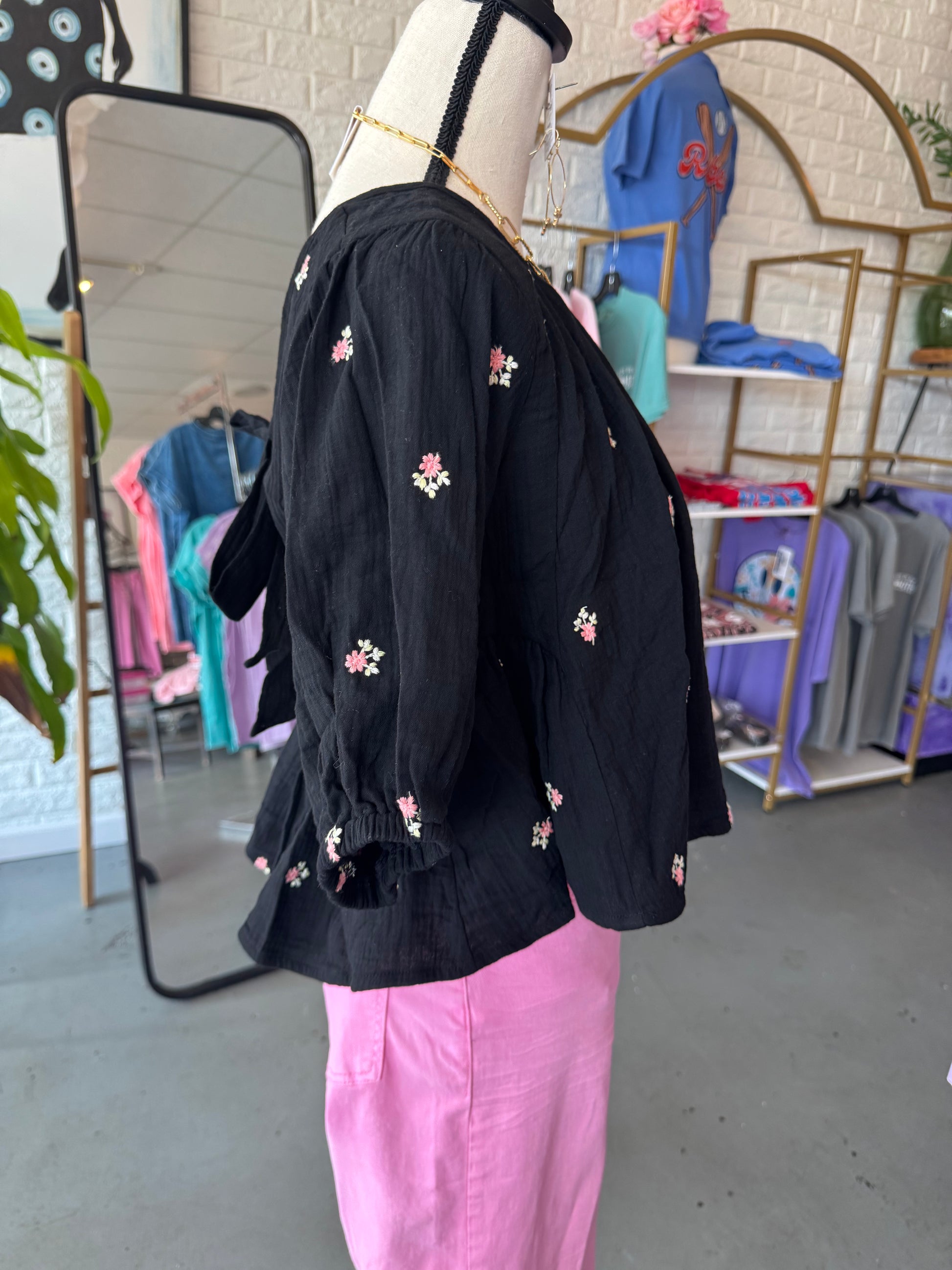 The Emory Top is made from 100% cotton with a beautiful flower detail. It features a tie back and elastic band sleeves for a comfortable and stylish fit. Perfect for adding a feminine touch to your wardrobe fitting true to size.