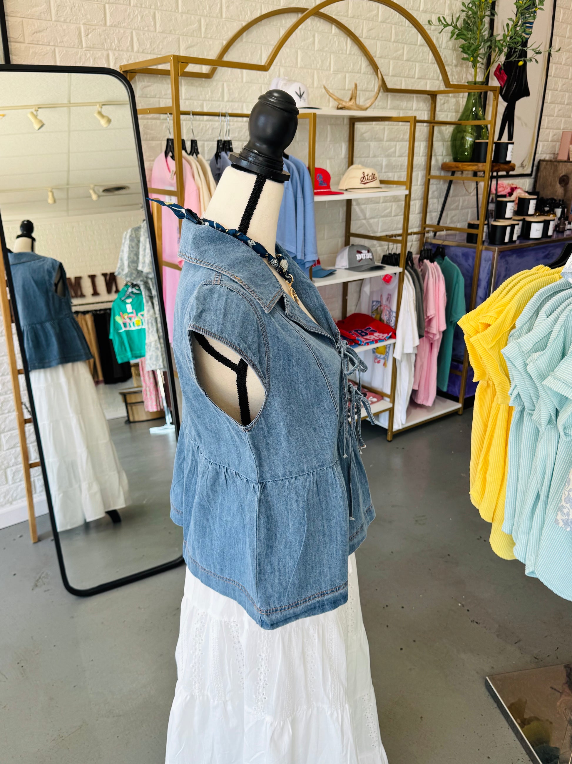 This Little Denim Top features a stylish collar, v-neck, and front tie closure for a perfect fit. Designed to be true to size, it's the perfect choice for a date night ensemble. Elevate your wardrobe with this versatile and fashionable piece.