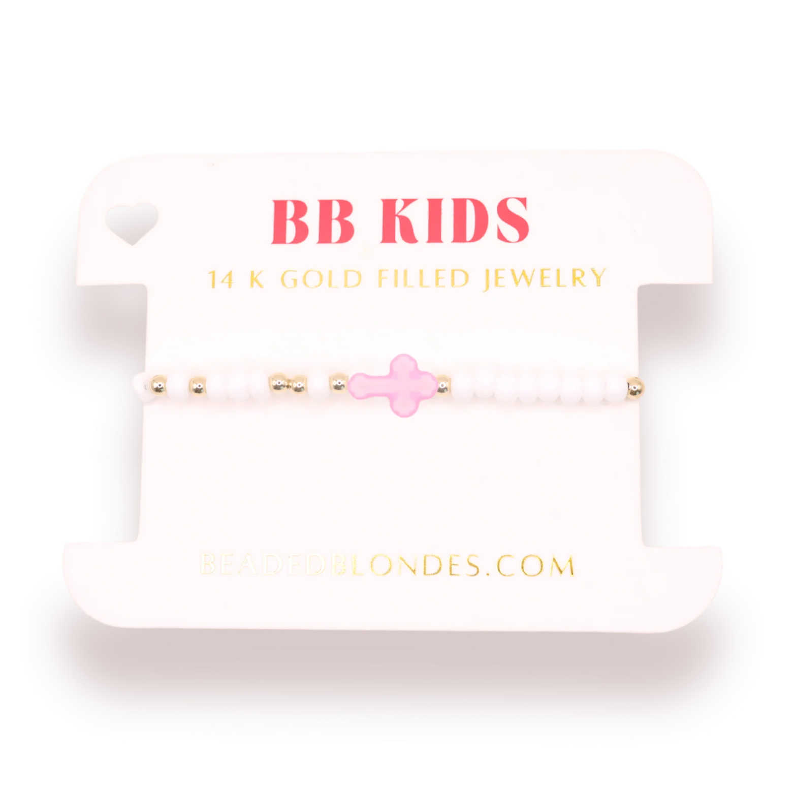 This is our sprinkle + gold stackable beaded bracelet with a cross bead for kids size 5.5 inch