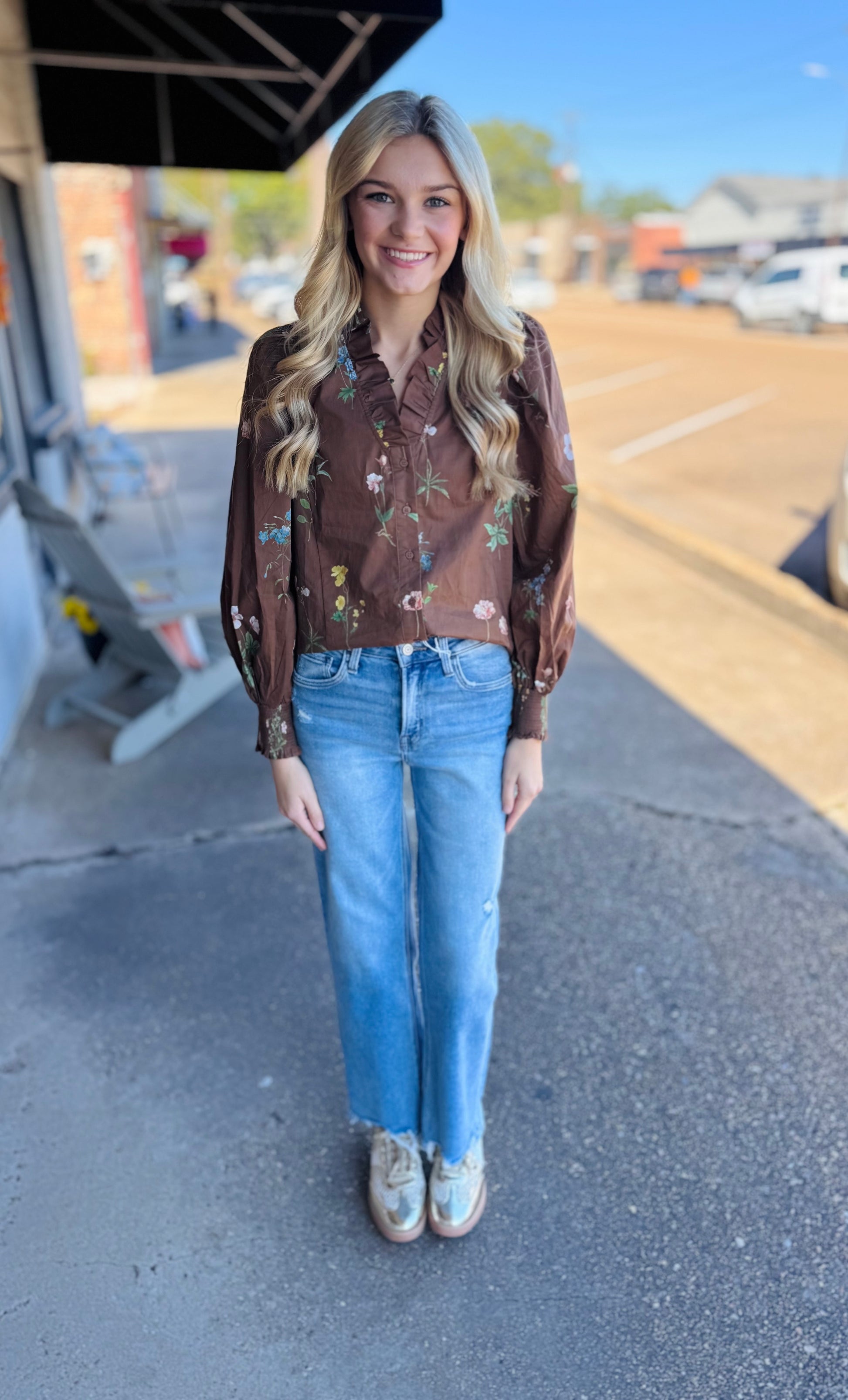 Introducing our Wild Flower Garden Top, featuring a beautiful flower pattern with a ruffle neck detail and v-neck button down. Designed to be true to size, this top combines style and comfort effortlessly. Upgrade your wardrobe with this must-have piece.